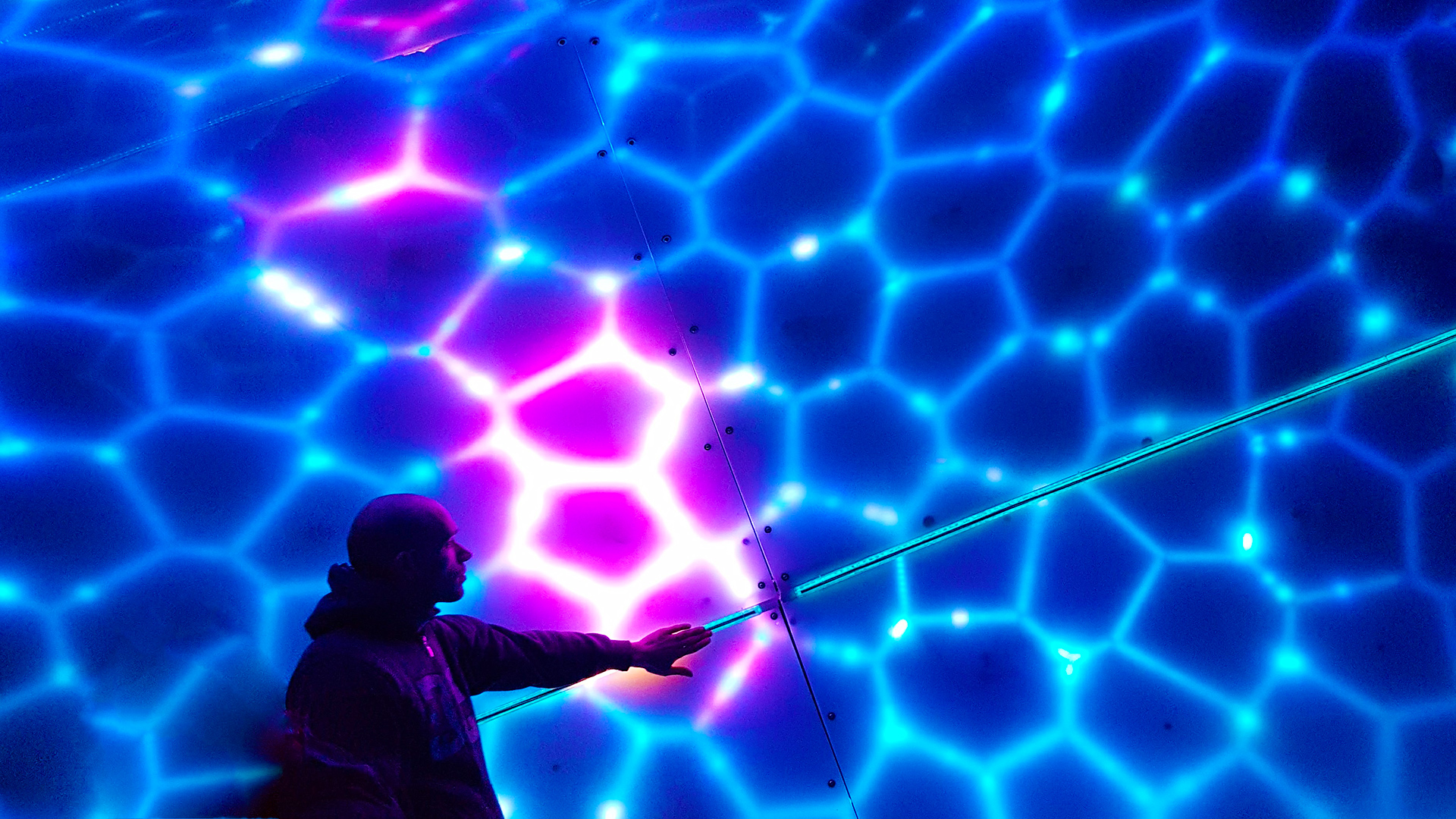 The piece represents a wave slamming against the side of the canal, over the sidewalk and covering the visitors of the festival. Visitors can touch the inside of the wave, triggering a beam of love that travels through the wave to the fountain head-sculptures on the back that salute the visitors on boats with kissing hand gestures. The wave lights up with a LED voronoi pattern, pointing out the relation between technology and nature.
